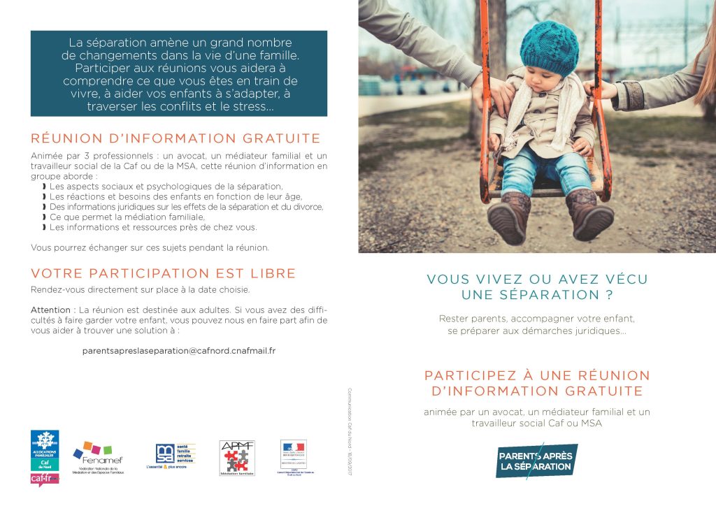 Afin de vous permettre de trouver les premières réponses à vos questions, vous pouvez vous rendre aux séances d’informations collectives gratuites « être parents après la séparation ». Ces séances sont co-animées par un avocat, un médiateur familial et un travailleur social de la CAF afin que l’information donnée soit la plus complète possible.
